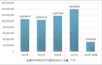 2016年我國摩托車用新的充氣橡膠輪胎出口總量116977645千克,2017年出口總量138738044千克;2018年1季度出口總量31056185千克。