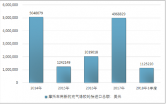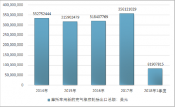2016年我國摩托車用新的充氣橡膠輪胎出口總額318407769美元,2017年出口總額356121029美元;2018年1季度出口總額81907815美元。