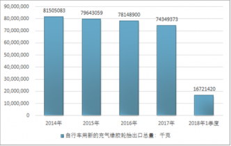 2016年我國自行車用新的充氣橡膠輪胎出口總量78148900千克,2017年出口總量74349373千克;2018年1季度出口總量16721420千克。