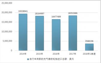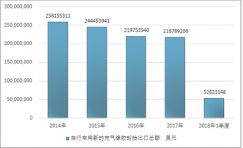 2016年我國自行車用新的充氣橡膠輪胎出口總額219753940美元,2017年出口總額216789206美元;2018年1季度出口總額52823148美元。