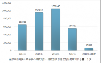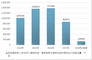 2016年我國航空器用實心或半實心橡膠輪胎、橡膠胎面及橡膠輪胎襯帶進出口貿(mào)易總量1372490千克,2017年進出口貿(mào)易總量864015千克;2018年1季度進出口貿(mào)易總量134459千克。