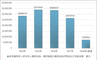 2016年我國航空器用實心或半實心橡膠輪胎、橡膠胎面及橡膠輪胎襯帶進出口貿(mào)易總額33369237美元,2017年進出口貿(mào)易總額26379714美元;2018年1季度進出口貿(mào)易總額7253521美元。