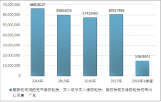 2016年我國(guó)翻新的或舊的充氣橡膠輪胎;實(shí)心或半實(shí)心橡膠輪胎、橡膠胎面及橡膠輪胎襯帶出口總量57413463千克,2017年出口總量60317986千克;2018年1季度出口總量14649044千克。
