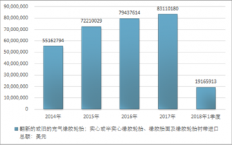 2016年我國(guó)翻新的或舊的充氣橡膠輪胎;實(shí)心或半實(shí)心橡膠輪胎、橡膠胎面及橡膠輪胎襯帶進(jìn)口總額79437614美元,2017年進(jìn)口總額83110180美元;2018年1季度進(jìn)口總額19165913美元。