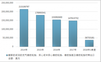 2016年我國(guó)翻新的或舊的充氣橡膠輪胎;實(shí)心或半實(shí)心橡膠輪胎、橡膠胎面及橡膠輪胎襯帶出口總額153092600美元,2017年出口總額147613732美元;2018年1季度出口總額36733181美元。