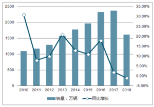 2010-2018年中國狹義乘用車市場銷量及同比增長走勢
