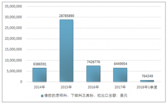 2016年我國(guó)橡膠的廢碎料、下腳料及其粉、粒進(jìn)出口貿(mào)易總額7426776美元,2017年進(jìn)出口貿(mào)易總額6449954美元;2018年1季度進(jìn)出口貿(mào)易總額764249美元。