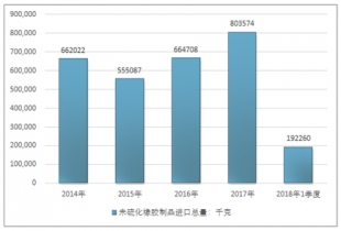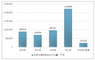 2016年我國未硫化橡膠制品出口總量961327千克,2017年出口總量2209085千克;2018年1季度出口總量227334千克。