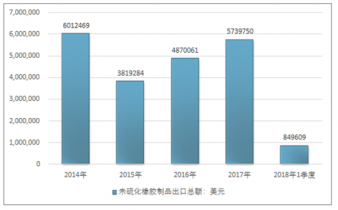 2016年我國未硫化橡膠制品出口總額4870061美元,2017年出口總額5739750美元;2018年1季度出口總額849609美元。