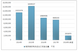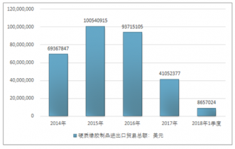 2016年我國硬質橡膠制品進出口貿易總額93715105美元,2017年進出口貿易總額41052377美元;2018年1季度進出口貿易總額8657024美元。