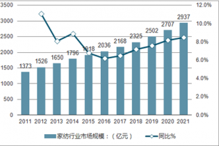 2011-2021 我國家紡行業(yè)市場規(guī)模及增速(億元)