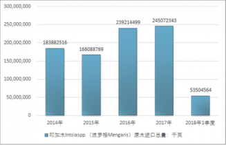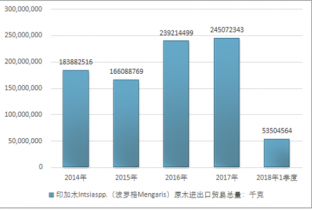 2016年我國(guó)印加木Intsiaspp.(波羅格Mengaris)原木進(jìn)口總量239214499千克,2017年進(jìn)口總量245072343千克;2018年1季度進(jìn)口總量53504564千克。
