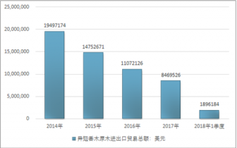 2016年我國(guó)異翅香木原木進(jìn)出口貿(mào)易總額11072126美元,2017年進(jìn)出口貿(mào)易總額8469526美元;2018年1季度進(jìn)出口貿(mào)易總額1896184美元。