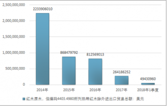2016年我國紅木原木,但編碼4403.4980所列熱帶紅木除外進出口貿(mào)易總額812569013美元,2017年進出口貿(mào)易總額264186252美元;2018年1季度進出口貿(mào)易總額49430960美元。