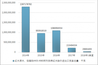 2016年我國紅木原木,但編碼4403.4980所列熱帶紅木除外進出口貿(mào)易總量1086994554千克,2017年進出口貿(mào)易總量215494334千克;2018年1季度進出口貿(mào)易總量29691655千克。