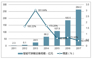 2017年我國智能可穿戴設(shè)備市場規(guī)模為264.2億元,較2016年增長42.43%,行業(yè)呈現(xiàn)穩(wěn)步快速增長。