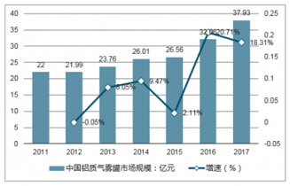 2011-2017年我國(guó)鋁質(zhì)氣霧罐市場(chǎng)規(guī)模及增速走勢(shì)圖