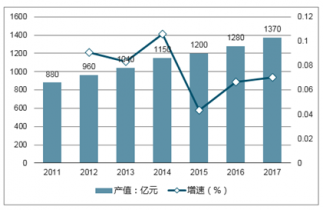 2011-2017年我國木門行業(yè)產(chǎn)值及增速走勢圖