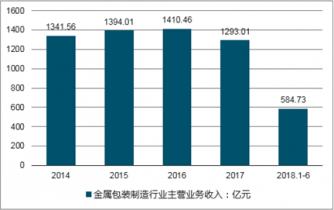 根據(jù)數(shù)據(jù)顯示,2017 年我國金屬包裝容器制造行業(yè)主營業(yè)務收入1293.01 億元,同比增長4.77%。2018年1-6月全國金屬包裝容器制造行業(yè)累計完成主營業(yè)務收入584.73億元,同比增長9.85%