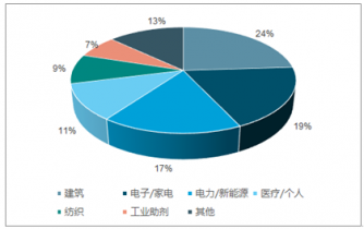 隨著國內有機硅生產能力提高,而國外企業產能萎縮,有機硅進口量逐步下降,而出口量逐步增長。2017年,中國聚硅氧烷消費比例預測如下圖所示,其中建筑、電子/家電、電力/新能源、醫療及個人護理、紡織服裝、工業助劑等領域,分別占硅氧烷消費總量的24%、19%、17%、11.0%、9%和7%,日用品和交通領域分別占4%和2%,仍有較大的發展空間。