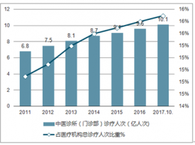 中醫(yī)類醫(yī)療機(jī)構(gòu)診療人次逐年增加,截止2017年10月,診療人次已經(jīng)突破10億人次。同時,中醫(yī)類醫(yī)療機(jī)構(gòu)診療人次占醫(yī)療機(jī)構(gòu)總診療人次的比重也在持續(xù)增加,7年間增加了1個百分點(diǎn)。這表明,中醫(yī)類醫(yī)療機(jī)構(gòu)的服務(wù)能力提高,在整個醫(yī)療體系中所起的作用越來越大。