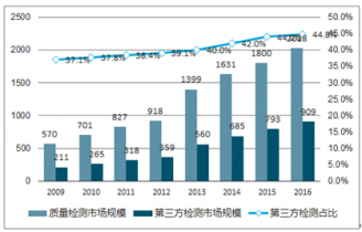 我國(guó)檢驗(yàn)檢測(cè)市場(chǎng)高速增長(zhǎng),其中,第三方檢測(cè)達(dá)近千億規(guī)模,2009-2016 年復(fù)合增速高達(dá) 23%。我國(guó)近年持續(xù)加大食品、環(huán)境、醫(yī)藥及工業(yè)等領(lǐng)域產(chǎn)品質(zhì)量把控。檢測(cè)覆蓋領(lǐng)域持續(xù)擴(kuò)大,檢測(cè)項(xiàng)目也不斷細(xì)化,檢測(cè)行業(yè)持續(xù)高速發(fā)展。根據(jù)統(tǒng)計(jì),截至 2016 年,我國(guó)檢測(cè)行業(yè)市場(chǎng)規(guī)模達(dá)2028億元,其中第三方檢測(cè)達(dá) 908億元,2009-2016 年第三方檢測(cè)市場(chǎng)規(guī)模復(fù)合增速高達(dá) 23%,第三方檢測(cè)占比由 2009 年的 37%提升至 2016 年的45%。