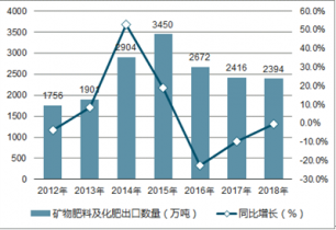 2012-2018年中國礦物肥料及化肥出口數(shù)量統(tǒng)計(jì)圖