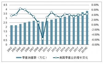 2002-2019年美國(guó)年度零售銷(xiāo)售及增長(zhǎng)變化預(yù)測(cè)