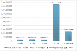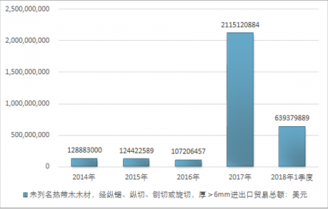 2016年我國未列名熱帶木木材,經(jīng)縱鋸、縱切、刨切或旋切,厚>6mm進(jìn)出口貿(mào)易總額107206457美元,2017年進(jìn)出口貿(mào)易總額2115120884美元;2018年1季度進(jìn)出口貿(mào)易總額639379889美元。