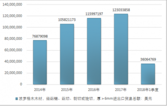 2016年我國波羅格木木材,經(jīng)縱鋸、縱切、刨切或旋切,厚>6mm進出口貿(mào)易總額115997197美元,2017年進出口貿(mào)易總額123033858美元;2018年1季度進出口貿(mào)易總額36064769美元。