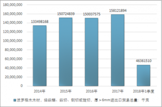 2016年我國波羅格木木材,經(jīng)縱鋸、縱切、刨切或旋切,厚>6mm進出口貿(mào)易總量150037575千克,2017年進出口貿(mào)易總量158121894千克;2018年1季度進出口貿(mào)易總量46361510千克。