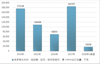 2016年我國波羅格木木材,經(jīng)縱鋸、縱切、刨切或旋切,厚>6mm出口總量68855千克,2017年出口總量183787千克;2018年1季度出口總量16638千克。