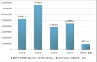 2016年我國(guó)其他中密度板0.5g/cucm<密度≤0.8g/cucu,厚≤5mm進(jìn)出口貿(mào)易總額38227335美元,2017年進(jìn)出口貿(mào)易總額44295049美元;2018年1季度進(jìn)出口貿(mào)易總額9631581美元。