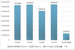 2016年我國(guó)其他中密度板0.5g/cucm<密度≤0.8g/cucu,厚≤5mm進(jìn)出口貿(mào)易總量60959723千克,2017年進(jìn)出口貿(mào)易總量74856304千克;2018年1季度進(jìn)出口貿(mào)易總量13605071千克。
