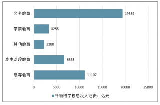 整理分析得出,各領(lǐng)域教育經(jīng)費(fèi)總投入在學(xué)前教育、義務(wù)教育、高中階段教育、高等教育和其他教育間的分配為3255億元、19359億元、6638億元、11107億元、2200億元,義務(wù)教育由于體量最大,成為教育經(jīng)費(fèi)總投入最高領(lǐng)域。