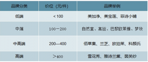 按照各品牌商品的平均價位,可以將彩妝品牌分為低端、中端、中高端和高端,低端品牌的價位通常低于100元,中端品牌的價位通常介于100-200元之間,中高端品牌通常位于200-400元,高端品牌的價位通常要高于400元。