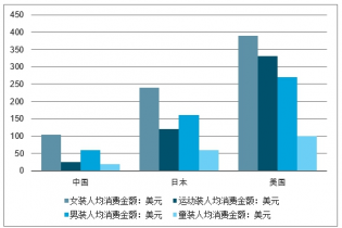 中美日中各品類人均服裝消費(fèi)金額對(duì)比(單位:美元)