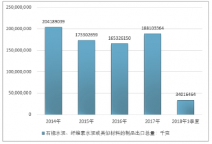 2016年我國石棉水泥、纖維素水泥或類似材料的制品出口總量165326150千克 ,2017年出口總量188103364千克 ;2019年1季度出口總量34016464千克 。