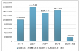 2016年我國石棉水泥、纖維素水泥或類似材料的制品出口總額132964348美元,2017年出口總額144935730美元;2019年1季度出口總額19272633美元。