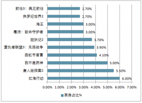 2018年全國電影票房分布情況:《紅海行動》占據(jù)總票房6%,《唐人街探案2》占比5.5%,《我不是藥神》占5%,《西虹市首富》占比4.1%。排名前四位的電影票房占比合計占當年總票房的20.6%。