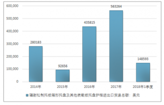 2016年我國(guó)輻射松制托板箱形托盤(pán)及其他裝載板托盤(pán)護(hù)框進(jìn)出口貿(mào)易總額435815美元,2017年進(jìn)出口貿(mào)易總額563264美元;2018年1季度進(jìn)出口貿(mào)易總額148593美元。