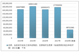 2016年我國亞麻,生的或已經(jīng)加工但未紡制的;亞麻短纖及廢麻(包括廢麻紗線及回收纖維)進(jìn)口總量165092472千克,2017年進(jìn)口總量177930304千克;2018年1季度進(jìn)口總量48721560千克。