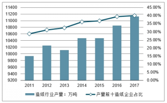 2011-2017年中國造紙行業(yè)產(chǎn)量及產(chǎn)量前十造紙企業(yè)占比