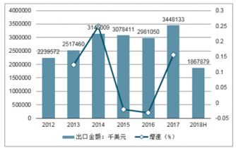 2012-2018H年中國紡織機械及零件出口金額統(tǒng)計圖