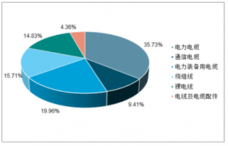 電線電纜產(chǎn)品包括電力電纜、通信電纜、電氣裝備用電纜及裸電線、繞組線等,目前電力電纜仍占據(jù)著我國電線電纜行業(yè)最主要地位,2017年規(guī)模占比達35.73%;其次是電氣裝備用電纜,占比為19.96%;繞組線、裸電線規(guī)模比重也超過兩位數(shù),分別達15.71%、14.83%。