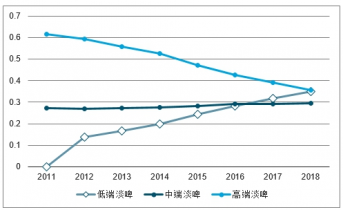 隨著消費升級和我國消費者群體構(gòu)成、消費口味、觀念的變化,我國啤酒市場消費結(jié)構(gòu)也隨之改變,低端淡啤的市場份額在逐年下降,而中高端啤酒的市場的市場份額則在快速增長。據(jù)統(tǒng)計,中國中高檔啤酒(終端統(tǒng)計價格7元及以上/L)占比已從2011年的38.4%提升至2017年的60.9%。未來在消費者中高檔消費偏好加速,以及啤酒產(chǎn)商主推下,預計中高檔啤酒的占比仍將進一步提升。