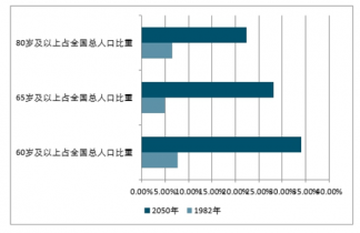 60歲及以上老年人口占全國總?cè)丝诘谋壤?982年的7.63%持續(xù)增加到2050年的34.1%;65歲及以上老年人口占全國總?cè)丝诘谋壤?982年的4.91%持續(xù)增加到2050年的28.1%;80歲及以上老年人口占60歲及以上老年人口的比例,由1982年的6.59%持續(xù)增加到2050年的22.36%。
