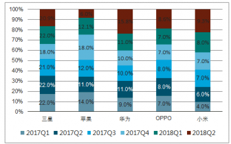 2017Q1-2018Q2全球智能手機(jī)出貨量圖