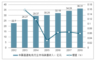 2012-2018年中國高速電機(jī)市場(chǎng)銷售收入統(tǒng)計(jì)及增速