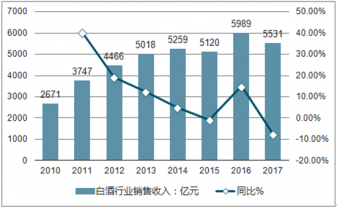 2010-2017年中國白酒行業(yè)銷售收入(單位:億元,%)
